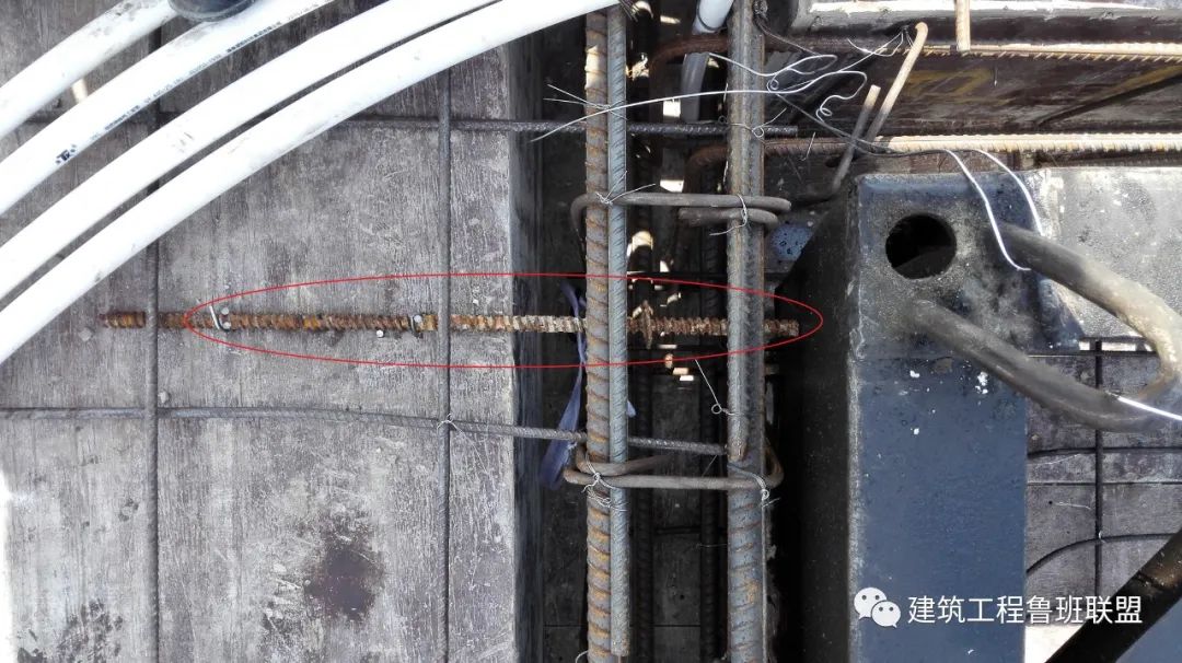 2)平面定位:平面定位复核完成须将其平面位置固定,以免混凝土浇筑时偏位。在吊模四周楼板底模上各固定2个止水螺杆式固定件,四个方向同时顶撑吊模使其固定。如下图所示。