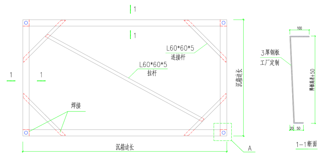 1)依据工程建筑、结构施工图,对各沉箱卫生间尺寸进行复核,确定定型钢模尺寸。定型钢模高度宜较降板高差高50mm。同时为拆模方便定型钢模板底口内收20mm,使整体钢模呈倾斜状,如下图。钢模模板采用3.0厚的钢板冷压成型,同时为保证钢模整体性,角部设L60*60*5连接杆及对拉拉杆,具体做法如下图所示。
