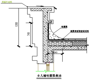 屋面女儿墙泛水节点做法:找平层抹成50mm为半径的圆弧,防水卷材增加附加层(宽度和高度均不应小于25cm),卷材翻起至泛水底部,防水卷材施工至女儿墙泛水檐口底部,所有防水卷材收头处均用密封材料填嵌封严。外部贴30厚保温层施工与女儿墙混凝土相连。女儿墙防水的圆弧做法具体做法见下图(出屋面的烟风道和排风井圆弧参照此图施工)。