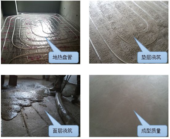 1、首先在地热采暖管铺设完毕后先进行第一次混凝土垫层浇筑,浇筑标高控制在地热管上皮标高,然后用刮杠平地热管上皮刮平,振捣密实;待垫层混凝土达到初凝后便可以进行第二次混凝土面层浇筑,面层浇筑厚度≥30mm。
