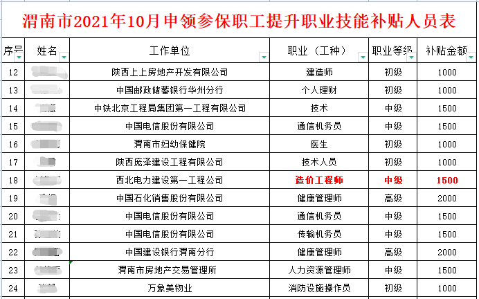 渭南市2021年10月申领参保职工提升职业技能补贴人员公示