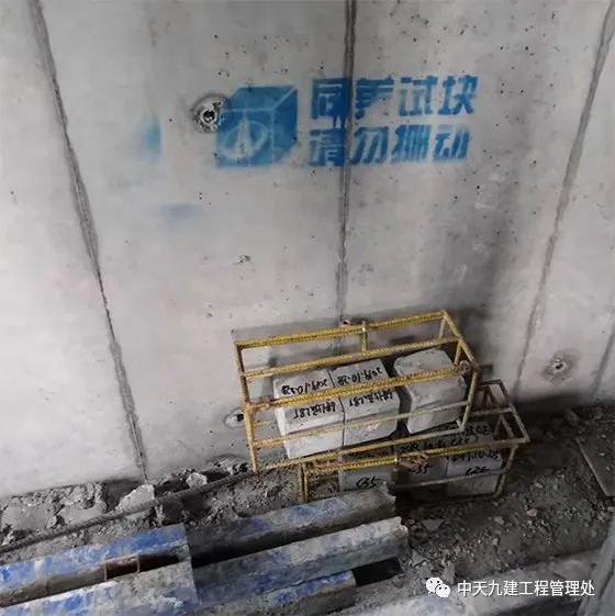 项目部设置专职质检员,按规范要求留置同养试块及标养试块,同养试块拆模后放置于对应楼楼梯口处,并上锁管理,到达期龄后及时送检。