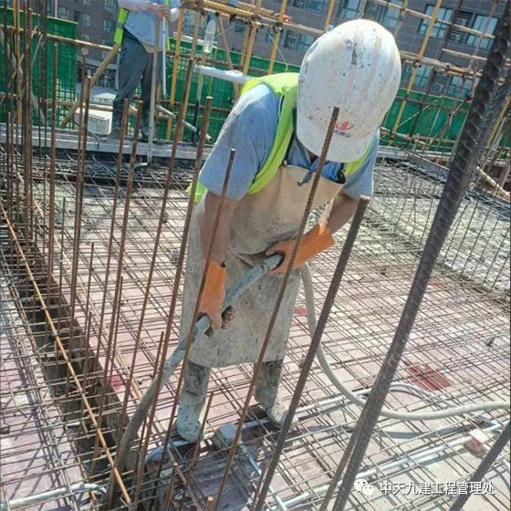 混凝土浇筑前,组织管理人员、班组人员进行交底。振捣时应快插慢拔,以混凝土不再显著下沉,不出现气泡,开始泛浆为准,移动间距不超过振捣器作用半径的1.25倍。