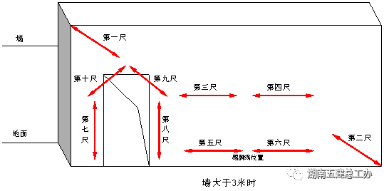 (2)当墙长度小于3米时,同一面墙距两端头竖向阴阳角约30cm位置,分别按以下原则实测2次:一是靠尺顶端接触到上部砼顶板位置时测1次垂直度,二是靠尺底端接触到下部地面位置时测1 次垂直度;