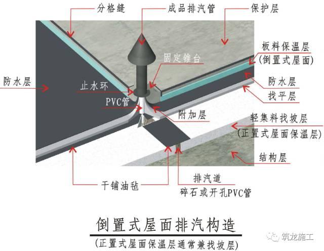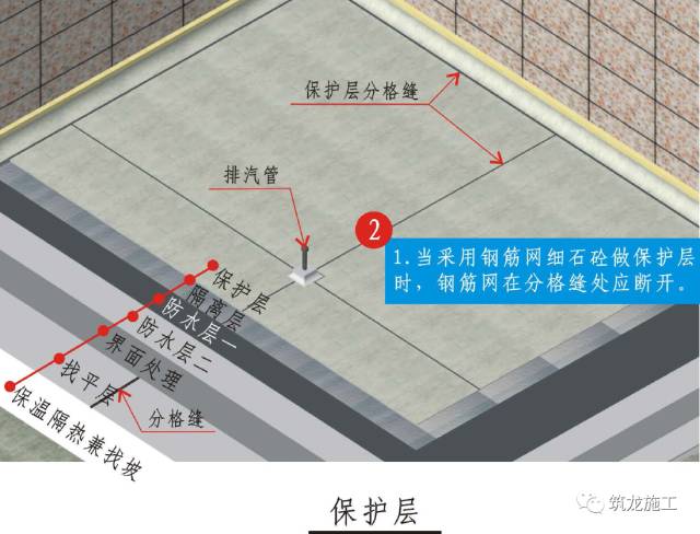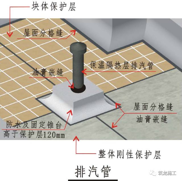4、伸出屋面保护层的管道、设备和预埋件(包括排气管)周围应做防水和固定锥台,其与保护层、防水锥台间留凹槽,并嵌填密封材料。