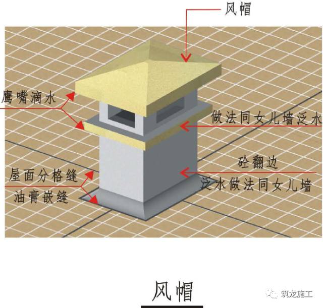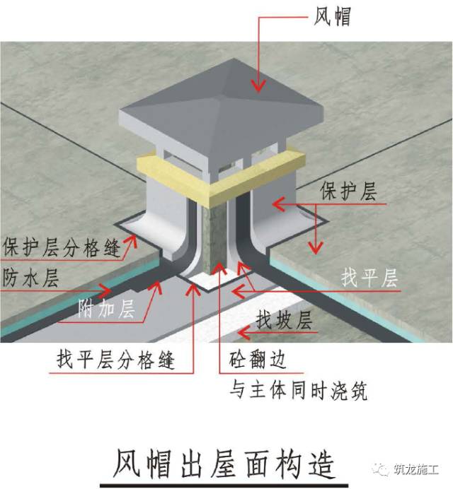 1、屋顶风帽砼翻边与主体结构同时浇筑,高出屋面建筑做法顶面至少250mm。