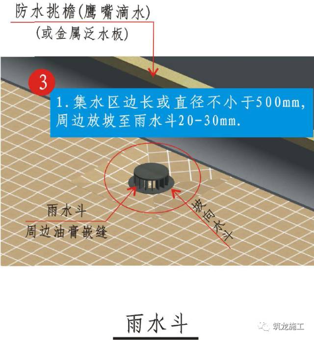 2、雨水篦子安放处面层标高应比屋面面层低20mm,并确保篦子周围嵌填严密。