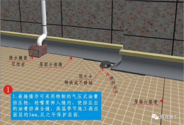 3、屋面面层分格缝或伸缩缝嵌入油膏或密封膏前应在缝内均匀涂刷冷底子油。