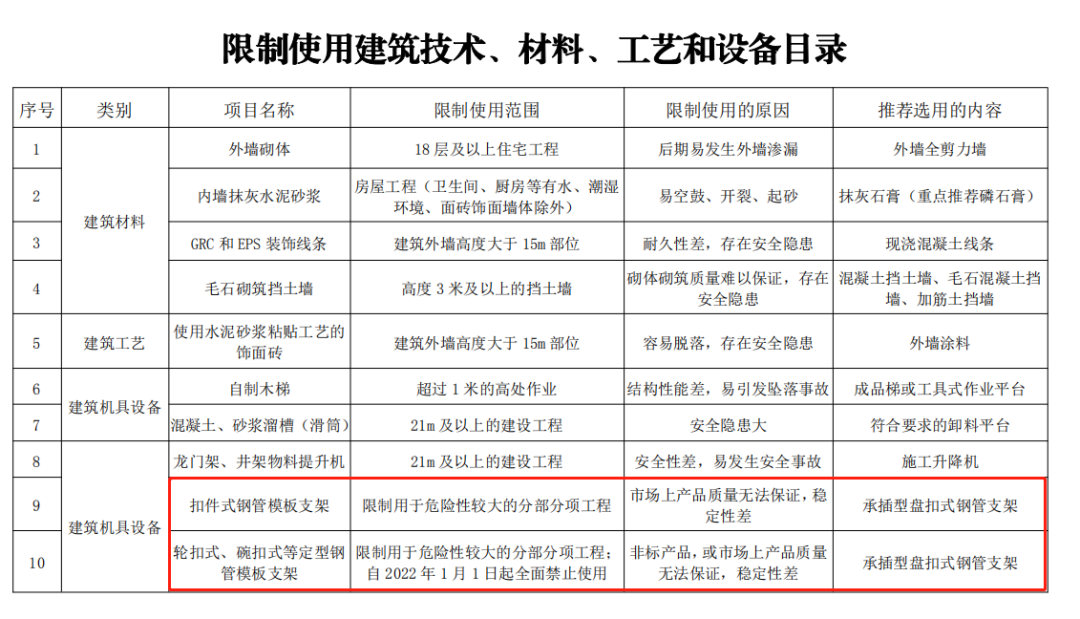 在重庆市发布的《重庆市建设领域禁止、限制使用落后技术通告(2019年版)》,也对扣件式钢管脚手架的使用作了限制。