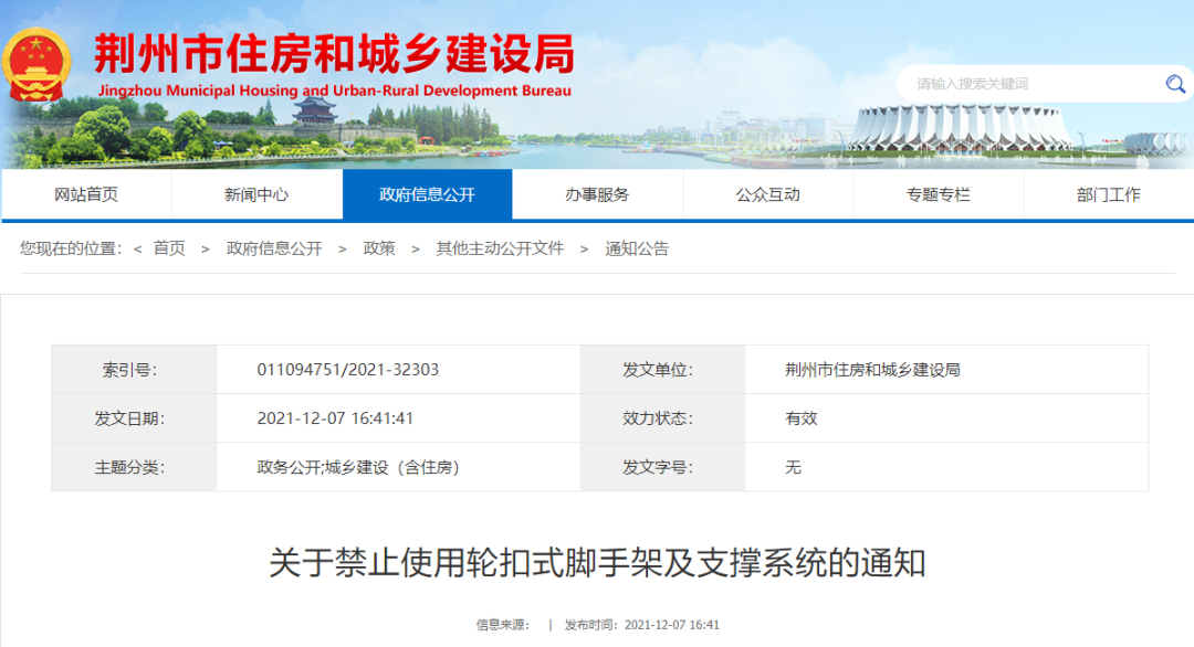 12月7日,湖北荆州发布《关于禁止使用轮扣式脚手架及支撑系统的通知》,提出: