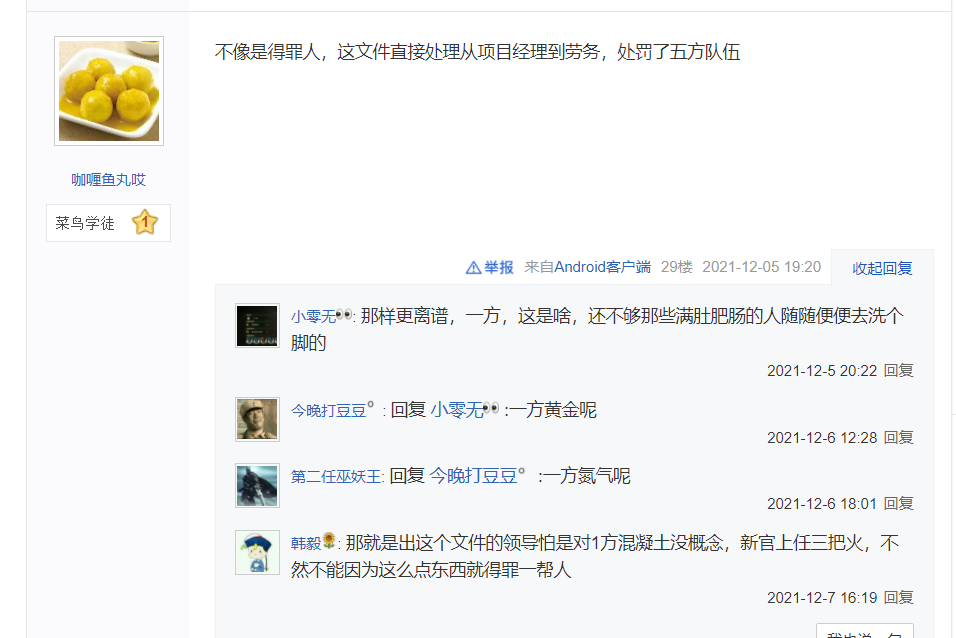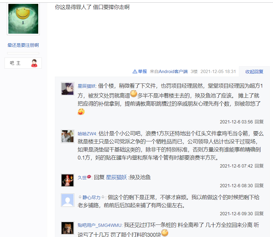 某公司施工员晚上加班打混凝土打到十一点半,因为施工结束多剩下一方混凝土没有合理处置,直接让商砼站拉回去。被人举报到公司后,公司非常严肃得对待此事件,直接发红头文件。