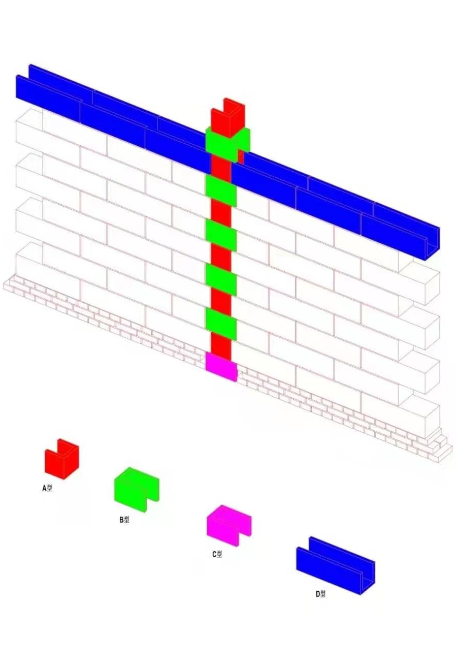预制成品U型构造柱砖、水平系梁砖,在砌筑过程中,构造柱钢筋绑扎完成后,U型砖开口朝两侧放置,随砌体同时砌筑施工,完成至一定高度后即可浇筑构造柱混凝土;水平系梁U型砖开口朝上随砌体一同砌筑,完成后放入水平系梁钢筋浇筑混凝土,免去支模环节。