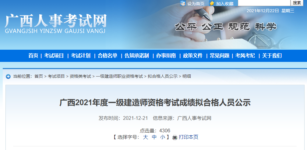 根据《司法部关于印发开展证明事项告知承诺制试点工作方案的通知》(司发通〔2019〕54号)、《人力资源社会保障部办公厅关于印发<人力资源社会保障系统开展证明事项告知承诺制试点工作实施方案>的通知》(人社厅发〔2019〕71号)及《人力资源社会保障部人事考试中心关于印发<专业技术人员资格考试报名证明事项告知承诺制试点工作实施方案>的通知》(人考中心函〔2019〕26号)的规定和要求,现将广西2021年度一级建造师资格考试成绩拟合格人员予以公示,共3634人(名单见附件)。