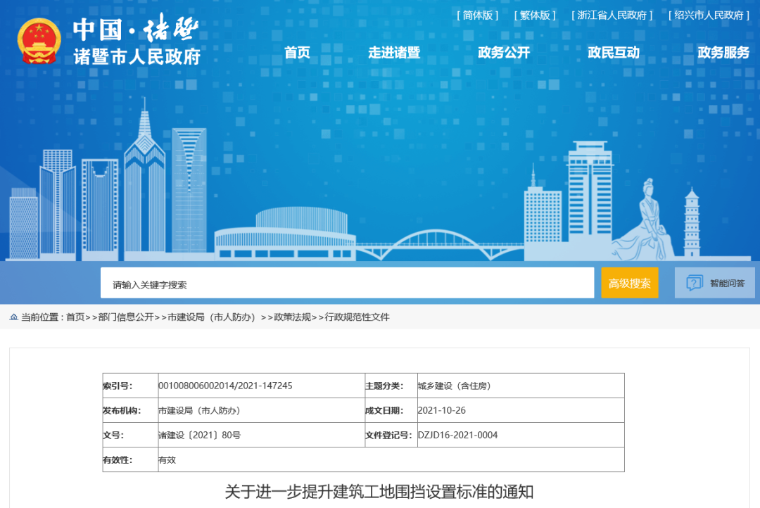 近期,浙江省诸暨市住建局发布《关于进一步提升建筑工地围挡设置标准的通知》。明确:城区建成区范围内房建项目建筑工地的围挡高度不低于5米。据小编所知,应该属于最高标准了。