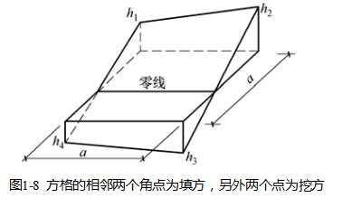 方格的相邻两个角点为填方,另外两个点为挖方,如图1-8所示。