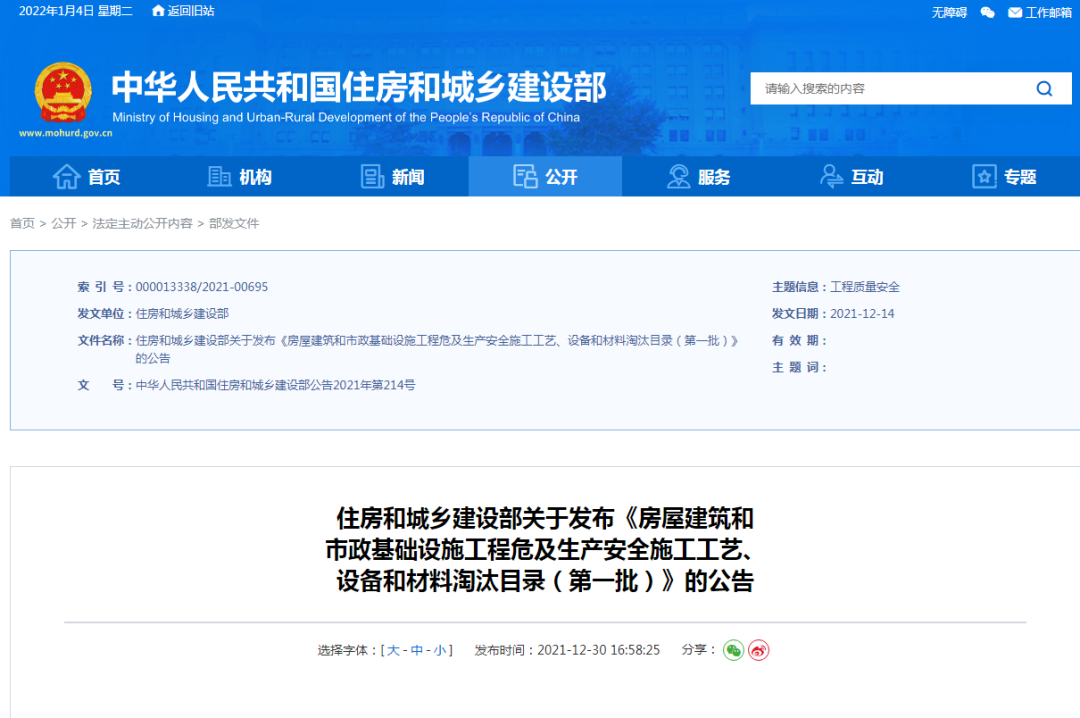 为防范化解房屋建筑和市政基础设施工程重大事故隐患,降低施工安全风险,推动住房和城乡建设行业淘汰落后工艺、设备和材料,提升房屋建筑和市政基础设施工程安全生产水平,根据《建设工程安全生产管理条例》等有关法规,我部组织制定了《房屋建筑和市政基础设施工程危及生产安全施工工艺、设备和材料淘汰目录(第一批)》(以下简称《目录》),现予发布。