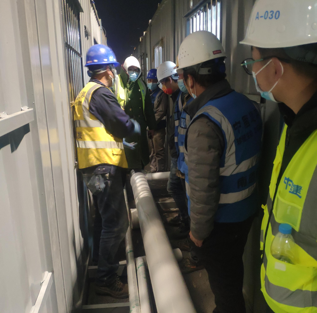 漆黑的夜晚下,项目安装经理、共产党员马鲁宁带领安装团队正在讨论着污水管主管道的敷设方案。由于此次施工是在市政道路上直接建设隔离板房,面临一个巨大的施工难题:污水管道无法布设在地下。而其他标段的施工方案中污水主管道多为贴地敷设,中间的绿化带道路标高将会比污水主管道管底标高高出15公分,很容易出现倒坡现象,导致污水倒流。经过一段时间的讨论,期间有人提出是否可以破除部分道路地面及绿化带,但很快就被否定,这样不仅会增加施工难度,还会大大延长施工时间。经过大家在现场来回的观察、测量、试验,集思广益提出了一个省时省力的好方法:架高污水主管道20公分,搭配使用踏板式冲水便器,同时在主管道和各房间支管间安设挡板,防止因下水设施封闭不当造成隔离人员间的交叉感染风险。方案一经提出就得到了所有人的赞成,安装团队迅速各就各位,现场党员先锋队和青年突击队区块班组率先连夜开展模型试验,经测量符合标准后立即推广施工,顺利解决了污水管道安装难题,为项目按时交付提供了坚强的保障。机器轰鸣的工地上