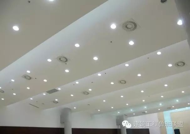 吊顶内的安装是鲁班奖必查的环节,顶棚以上管线末端,除了按地下室布局要求,整齐有序,支架设置合理外,末端器具与吊顶装饰的配合是十分关键的工序。在安装管线时,就应该考虑到灯具、喷淋头、烟温感器、喇叭、摄像头等等电器具出头的地方,以便在做顶棚时,做到居中对齐,不损伤吊顶龙骨。有些灯具还须加吊点,做到安全可靠。