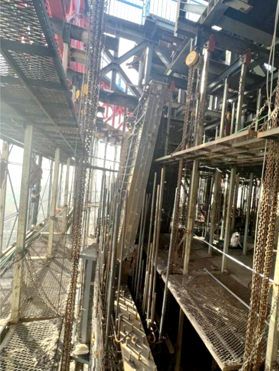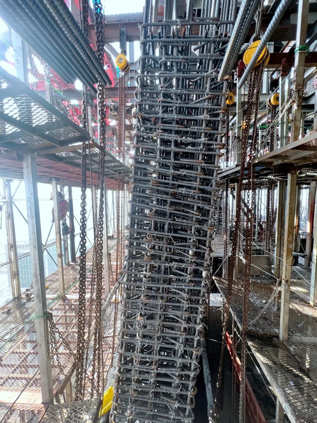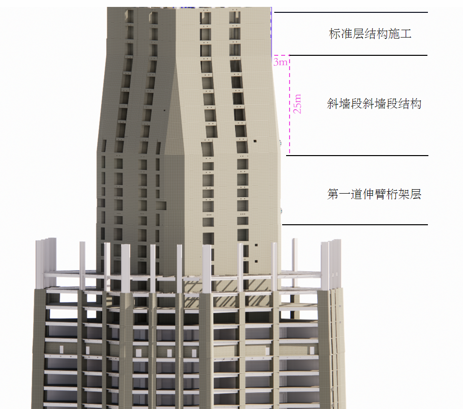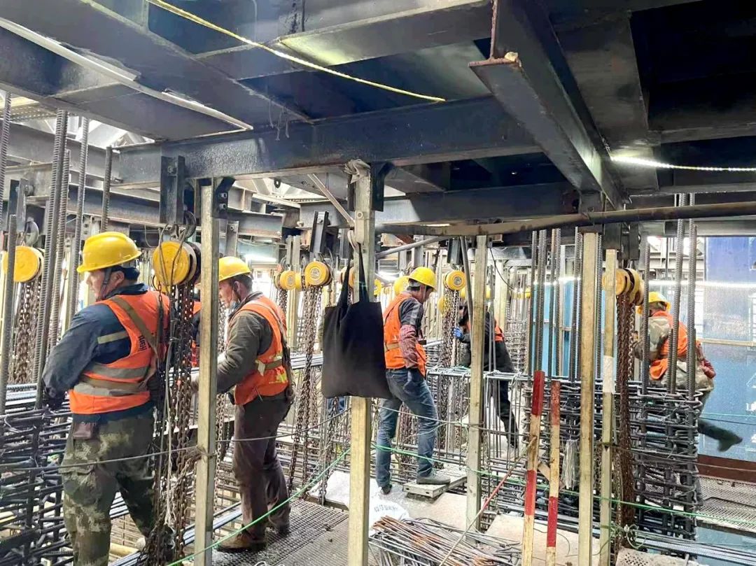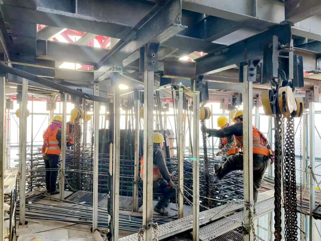 中国国际丝路中心大厦建设实景图 核心筒斜墙段施工难点国内外罕见 目前,项目正处于核心筒施工的重难点阶段,项目部全员和近300名一线劳动者们日夜兼程、全力以赴,充分利用晴好天气,24小时加急抢工,以“敢拼敢战、勇破难题”的铁军精神,力争抢出项目建设“加速度”,全力推进项目建设,向着年度生产目标不懈努力! 第一道伸臂桁架与斜墙段剖面示意图 第一道伸臂桁架施工后,塔楼核心筒外墙斜向内收缩,其中竖向跨越6层、单层收缩约500mm,单侧内收3.0m,此类核心筒结构收缩幅度在国内外同类型项目中非常罕见,因此带来的是空间钢结构、钢筋混凝土的斜向施工,在攻克技术的同时,需对材料、人员、安全、质量保障等做重大调整。 核心筒斜墙段立面示意图 项目采用斜向支模加固体系解决核心筒外墙施工 据项目负责人介绍,斜墙段施工需要对“造楼机”设计和结构进行局部拆改,十分耗时。同时,钢构柱、钢板剪力墙在造楼机内部的斜向安装焊接,空中斜墙支模体系的设计及加固均为技术及施工重难点。项目部需经过多次论证,实际施工过程中需交叉考虑多道工序,合理的工序穿插且有序施工,才能确保安全和质量可控,顺利推进建设。 斜墙段钢筋绑扎 斜墙段钢结构安装 斜墙段首次混凝土浇筑顺利完成 为确保项目快速树形象、展进度,项目部全员擂响战鼓、日夜奋战,疫情和春节期间持续施工,攻克斜墙段施工中的重难点问题,用“锚定目标、奋力奔跑”的精气神冲刺、冲刺、再冲刺! 施工方案多次进行专家论证 2021年,项目部针对关键部位施工开展多次专家论证会,充分评估施工方案结构复杂性及实施可行性。同时在施工过程中,持续深化各重难点施工措施,细化各技术关键点,明确技术、质量、安全各施工控制要点。 斜墙段钢筋绑扎施工图 项目部根据计划节点和施工情况,科学调整“造楼机”爬升规划、有序穿插各项工序、内外墙一次支模两次浇筑,多举措确保项目在困难阶段顺利推进。 斜墙段钢筋绑扎施工图 2月13日,项目顺利完成斜墙段首次混凝土浇筑,又一次突破本项目核心筒施工的技术难关,同时施工技术的可行性、现场管理的精细化得到了充分验证,为快速冲刺苍穹打下了坚实基础。 中国国际丝路中心大厦项目 中国国际丝路中心大厦项目位于沣东新城大西安科技创新引领轴的核心板块,是陕西省政府与绿地集团战略合作的重点项目。项目总建筑面积38.32万㎡,建筑高度为498m,地上共计100层。项目致力于打造集丝路国际会议中心、国际高端商业、甲级办公、超五星酒店、漫步云端观光为一体的大型城市综合体,预计2024年12月竣工。 中国国际丝路中心大厦项目效果图 中国国际丝路中心大厦包含82部高性能电梯,得房率约61%,窗墙比达到68%,可为企业和客户提供最大面的景观面,置身其中可俯瞰整个历史文化名城,登顶有“会当凌绝顶,一览众山小”的观感和气势。