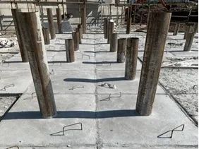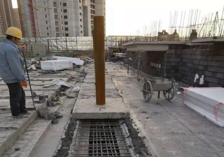 工艺流程 地库顶板后浇带预封闭技术示意图 操作要点 模具采用木方进行制作,预制盖板规格1.2m*1.2m*0.15m(长*宽*高),模具总宽度尺寸比后浇带宽度宽40cm,长度为1.2m。模具高度15cm。模具制作完成后可周转使用,在使用过程中需注意对模具的成品保护。 预制盖板模具 钢筋工根据模具尺寸进行钢筋下料,采用三级钢直径16@200双层双向,并进行钢筋的绑扎。钢筋绑扎完毕后需预埋吊钩,便于后续的吊运。预制盖板需间隔3米留置一个ф300的孔(板钢筋不断开)。 预制盖板钢筋绑扎 盖板钢筋绑扎完毕后,浇筑混凝土,混凝土采用主体结构浇筑时的余料进行浇筑,节约材料,浇筑完毕后及时进行覆膜养护,养护时间不得少于7天。 成型后效果 1、安装前准备工作 对后浇带内已经硬化的混凝土施工缝表面进行凿毛处理,剔除松散的石子,用高压水枪冲以露出坚硬的水泥及石子为宜。后浇带内的钢筋应按施工图纸中钢筋的间距进行调整,安排专人对钢筋进行恢复,对脱绑的钢筋进行满绑。后浇带内钢筋有油污、浮锈等现象安排专人进行清理干净。后浇带的模板及其支模架体系进行检查,支撑系统采用独立支撑体系,大横杆间距1.2-1.8m、立杆间距0.9m必须搭设稳固,有足够的刚度和强度。模板与已浇筑混凝土面搭接不少于100mm,接缝严密,板底平整度≤2mm,与已浇筑混凝土高低差≤2mm。支模架及模板应有足够的强度、刚度及稳定性。模板应严密不漏浆,且应保证砼施工后新旧砼没有明显接搓。将后浇带内的杂物等清理干净。安放预制盖板前,钢筋及模板应经过监理单位验收。 后浇带高压水枪清理效果 2、预制盖板安装 通过塔吊将预制盖板吊至后浇带指定位置,人工进行安放,预制盖板按照从后浇带一侧向另一侧依次安放的顺序,预制盖板每隔3米放置一个有ф300的圆孔的盖板,且在后浇带端部及拐弯处放置一个有圆孔的盖板。 在盖板上安放DN300铸铁管(高度比回填土厚度高200mm),铸铁管插入盖板内100mm深,四周用水泥砂浆密实,确保铸铁立管安装牢固,作为以后混凝土的浇筑孔,方便以后后浇带内混凝土的浇筑,以防自密实混凝土在拐弯处因阻力增大,自密实混凝土难以继续向前流动。 铸铁立管安装完毕后,采用胶带进行临时封口处理,避免在后浇带混凝土浇筑前,杂物掉进后浇带里面,无法清理。 预制盖板安装 3、防水及保护层施工 防水施工前进行找平层施工,防水可一次性施工到位,遇铸铁管按管根节点防水做法进行施工,铸铁管防水高度2m(高于回填土200mm),防水施工完毕后进行防水保护层施工,施工时需注意对铸铁管的成品保护,后浇带处预制盖板做一遍防水附加层,每层比盖板宽300mm。 车库顶板防水施工 车库顶板防水保护层施工 4、土方回填施工 在浇灌孔混凝土管四周1m远以内,不得用推土机、铲运机填土,不得用压路机压实;只能用人工铲土回填,用人工分层夯实。以免将预制钢筋混凝土挤偏,造成防水层破坏。 5、后浇带混凝土浇筑 后浇带达到主体封顶后14天,开始浇筑后浇带,采用自密实微膨胀混凝土通过铸铁管进行后浇带浇筑。每根立管混泥土浇筑至与回填土标高一致,混凝土达到强度后,将立管上部割除,采用SBS卷材进行立管上部封堵防水处理。 后浇带成型效果 6、园林景观绿化施工 在进行园林景观施工过程,避免车辆直接碾压立管。立管处做好相应标记。 7、注意事项 1)所用材料和半成品、成品进场后,应做质量检查和验收,其品种、配比、规格、性能必须符合设计和有关标准的要求。 2)铸铁立管安装时,需注意立管底禁止伸入后浇带内。 3)混凝土需采用自密实微膨胀、抗渗混凝土。 4)后浇带采用独立支撑体系。 5)在预制盖板封闭前,需对后浇带部位进行检查、处理,保证满足后浇带混凝土浇筑前的作业条件,在报监理验收合格后方可进行封闭。 6)在进行土方回填施工时,需配备车辆指挥人员,按照指定路线进行土方运输,避免对立管的破坏,且在回填立管四周土方时,禁止采用机械夯实,需采用人工进行分层夯实。