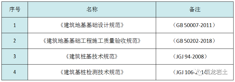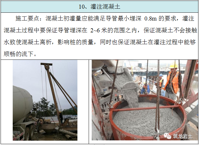 为确定钢筋笼顶标高,并保证钢筋笼的垂直放置,预先焊接两根等长度对称布置的吊筋,吊筋一般伸出孔口,作为判断钢筋笼上浮或下沉的依据。1)应先收紧内套钢丝绳将锥提起,检查锥的中心位置是否与护筒中心一致,检查锥架、底腿是否牢固,检查卷扬机和自动挂脱之间动作是否灵活、可靠。2)应根据冲岩土的松散度选择合适的冲程:冲松散层宜选小冲程(0.5-1.0m);冲砂卵石宜选中等冲程(1-2m);当砂卵石较密实时可加大冲程(2-3m);在基岩中冲击钻进时,宜采用高冲程(2.5-3.5m)。3)冲孔时应及时将孔内残渣排出,每冲击 1~2m,应排渣一次,同时检查成孔的垂直度,如发生斜孔、塌孔或护筒周围冒浆时,应停机,待采取相应措施后再进行施工,相邻桩机不宜过近,以免互相干扰,在刚灌注完毕混凝土的桩旁进行另一根桩成孔施工时,其安全距离应大于 4D(D 为桩直径),或最少时间间隔不应少 36 小时,以防止坍孔。每次捞渣后,应及时向孔内补充泥浆或黏土, 保持孔内水位高于地下水位 1.5-2.0m。应根据不同的钻孔方法、施工设备、设计要求及地层条件,来合理选用清孔方法。a.抽浆法清孔:抽浆法清孔较彻底,且清孔速度快,可适用于各类土层、各种钻孔方法的摩擦桩或支承桩,但在孔壁易坍塌的桩孔中应谨慎使用,以防坍孔。b.换浆法清孔:对以粘性土及细颗粒砂性土层为主的桩孔可采用换浆法清孔。采用该法清孔不易引起坍孔,但清孔速度慢,须控制好泥浆指标及清孔时间, 否则清孔效果难以保证。c.掏渣法清孔:对于冲击、冲抓、旋挖钻进的桩孔,应先采用掏渣法进行初步清孔,待较大颗粒沉渣清理完毕后,可换用换浆法进一步清孔,同时降低孔内泥浆密度。d.喷射法清孔:在导管等混凝土灌注设备已安装,实测孔底沉渣厚度超出规定或设计要求,但超出范围不大,进行二次清孔费时费力,且影响孔壁稳定的情况下,可采用喷射清孔法进行处理,并立即灌注水下混凝土。该法仅宜作为其他方法清孔的辅助手段。清孔持续时间应根据具体清孔方式、地质情况及孔底排出的泥浆指标确定, 抽浆法清孔的速度较快(一般不少于 10min 即可),换浆法清孔速度较慢(30min 至数小时不等),无论采用何种清孔方式,均应确保清孔持续时间,否则难以达到清孔效果。a.清孔过程泥浆指标清孔过程中泥浆密度一般应比钻孔泥浆密度小,但泥浆密度及粘度过小,影响孔壁稳定;采用正循环清孔时,泥浆密度及粘度过小,还会影响泥浆悬浮钻渣的能力,降低清孔效果。在粘性土、粉土及粉砂土为主的土层中,清孔过程中输入泥浆指标宜控制为:相对密度 1.05~1.10;粘度 16~20Pa·s;含砂率<4%。b.终止清孔泥浆指标终止清孔前应在孔底取泥浆进行性能指标检测,终止清孔泥浆指标一般控制在以下范围:相对密度 1.03~1.15;粘度 17~20Pa·s;含砂率<4%;胶体率>98%。4)缩短施工历时在确保清孔效果的同时,应加强工序衔接,提高工作效率,尽量缩短清孔至混凝土灌注之间的的时间间隔。5)进行首批混凝土灌注前,再次探测泥浆指标及孔底沉渣层厚度,如超过规定要求时,立即进行再次清孔,直至符合要求时方可灌注水下混凝土。根据建筑工程《地基基础工程施工质量验收规范》(GB 50202-2018),混凝土灌注桩的质量检验标准应符合表中的规定。
