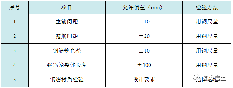 (1)灌注桩需提前用超前钻做施工勘察,避免将孤石作为承载岩层。(2)钢材、水泥等原材料的质量、检验项目、批量和检验方法,应符合国家现行标准的规定。(3)应严格对桩位进行检验,桩位的放样允许偏差群桩为 20mm,单排桩为10mm。(4)钢筋笼制作应对钢筋规格、焊条规格、品种、焊口规格、焊缝长度、焊缝外观和质量、主筋和箍筋的制作偏差等进行检查,钢筋笼制作允许偏差应符合规范要求。
