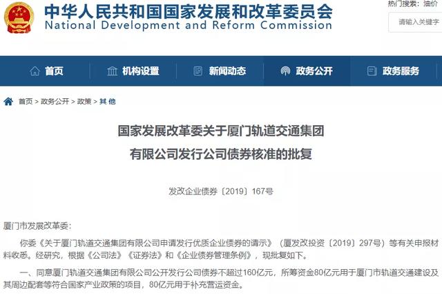 根据《国家发展改革委关于厦门轨道交通集团有限公司发行公司债券核准的批复》,同意厦门轨道交通集团有限公司公开发行公司债券不超过160亿元,所筹资金80亿元用于厦门市轨道交通建设及其周边配套等符合国家产业政策的项目,80亿元用于补充营运资金。