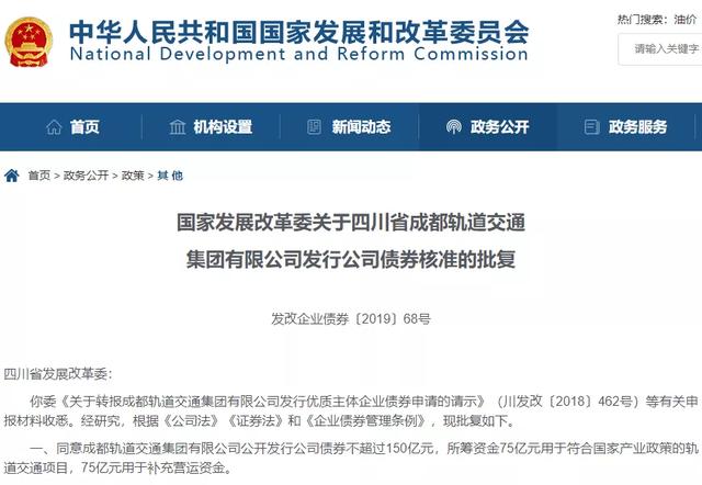 根据《国家发展改革委关于四川省成都轨道交通集团有限公司发行公司债券核准的批复》,同意成都轨道交通集团有限公司公开发行公司债券不超过150亿元,所筹资金75亿元用于符合国家产业政策的轨道交通项目,75亿元用于补充营运资金。