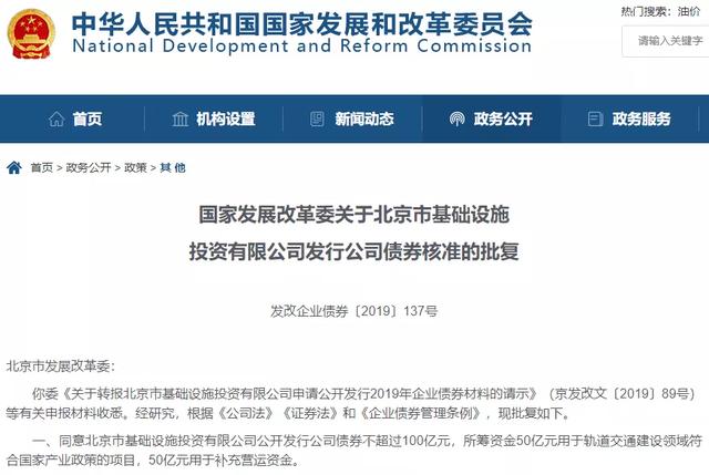 根据《国家发展改革委关于北京市基础设施投资有限公司发行公司债券核准的批复》,同意北京市基础设施投资有限公司公开发行公司债券不超过100亿元,所筹资金50亿元用于轨道交通建设领域符合国家产业政策的项目,50亿元用于补充营运资金。