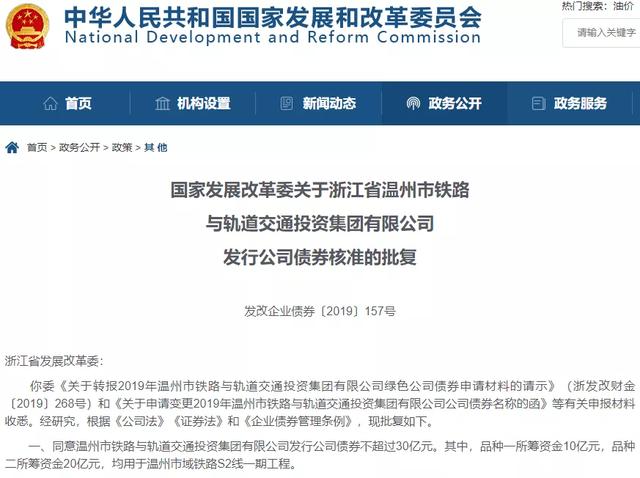 根据《国家发展改革委关于浙江省温州市铁路与轨道交通投资集团有限公司发行公司债券核准的批复》,同意温州市铁路与轨道交通投资集团有限公司发行公司债券不超过30亿元。其中,品种一所筹资金10亿元,品种二所筹资金20亿元,均用于温州市域铁路S2线一期工程。