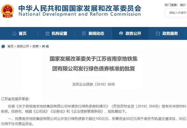 根据《国家发展改革委关于江苏省南京地铁集团有限公司发行绿色债券核准的批复》,同意南京地铁集团有限公司公开发行绿色债券不超过100亿元,所筹资金50亿元用于南京市轨道交通项目,50亿元用于补充营运资金。
