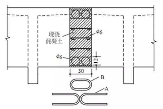 横隔梁在预制时在接缝处伸出钢筋扣环A,在相邻构件的扣环两侧再安装上腰圆形的接头扣环B,在形成的圆环内插入短分布筋后就现浇混凝土封闭接缝,接缝宽度为0.2-0.5m。