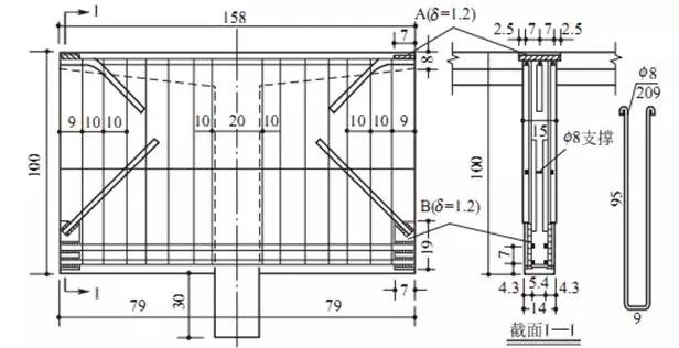 横隔梁的箍筋是抗剪的,在横隔梁顶部翼板内和靠近下部边缘的两侧均埋有焊接钢板A和B,焊接钢板则与横隔梁的受力钢筋焊接在一起做成安装骨架,当T梁安装就位后,即在横隔梁的预埋钢板上再加焊接钢板使连成整体。