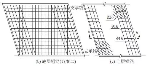 (b)在两钝角角点之间的范围内,主钢筋方向与支承边垂直,在靠近自由边处主钢筋则沿斜跨径方向布置,直至与中间部分主钢筋完全衔接为止,其横向分布钢筋与支承边平行。其余钢筋的配置仍与第一种方案相同。