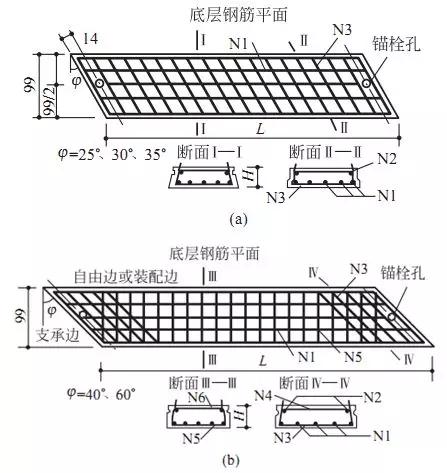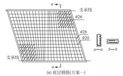 第一种方案:当斜交角为25-35° 时,主钢筋沿斜跨方向布置,分布钢筋按平行于支承边方向布置。