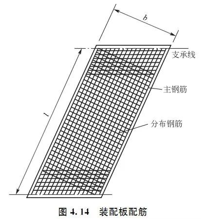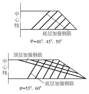 (a)图按主弯矩方向的变化配置主筋,其分布钢筋则与支承边平行,根据钝角处有较大的反力和负弯矩的特性,在钝角处约1/5跨径的范围内应配置加强钢筋。