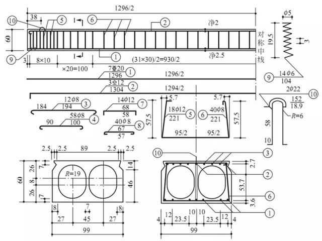梁:梁距通常在1.5-2.2m之间,梁高一般为跨径的1/18-1/11。