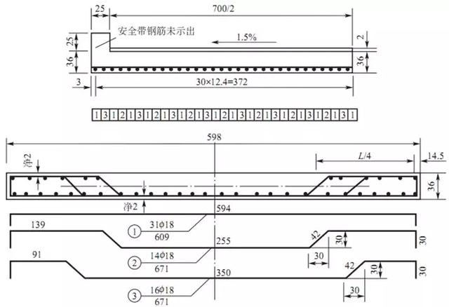 主筋直径>10mm,间距<20cm,在整体式板的主拉应力下,按计算不需要设置弯起钢筋,但习惯上仍然将一部分主钢筋弯起。通过支点的不弯起钢筋,每米板宽内不少于3根,截面积不少于主筋的1/4,弯起钢筋的弯起角度为30°或45°,弯起的位置为1/6-1/4跨径处。与板边缘间的净距应小于3cm。