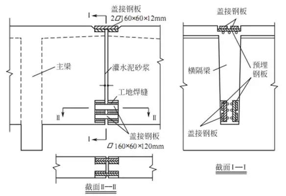 上缘接头钢板设在T梁翼板上,下缘接头钢板设在横梁梁肋的两侧,焊接钢板预先与横隔梁的受力钢筋焊接在一起做成安装骨架,当T梁安装就位后,即可在横隔梁的预埋钢板上再加焊接钢盖板使连成整体。