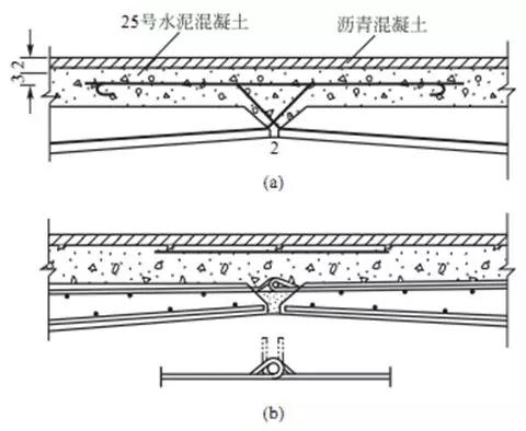 主翼板内伸出连接钢筋,交叉弯制后在接缝处再放局部的钢筋网,并将它们浇筑在桥面混凝土铺装层内,或者可将翼板的顶层钢筋伸出,并弯转套在一根长的钢筋上,以形成纵向铰。