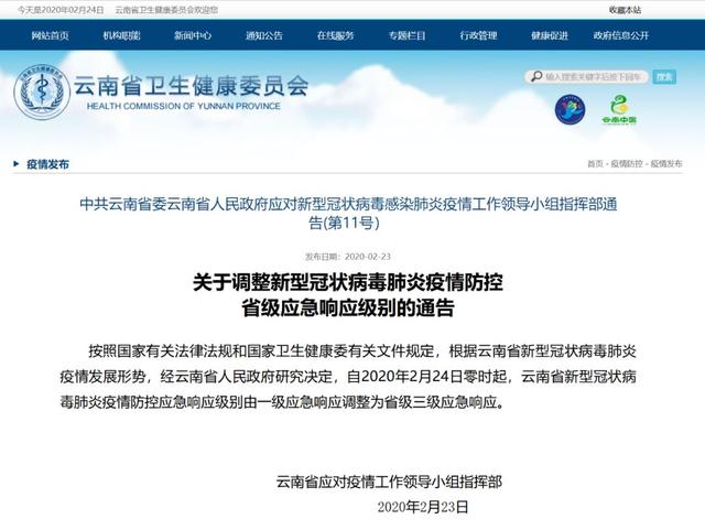 二、云南2020年2月24日起调整为三级响应(1月24日启动一级响应)