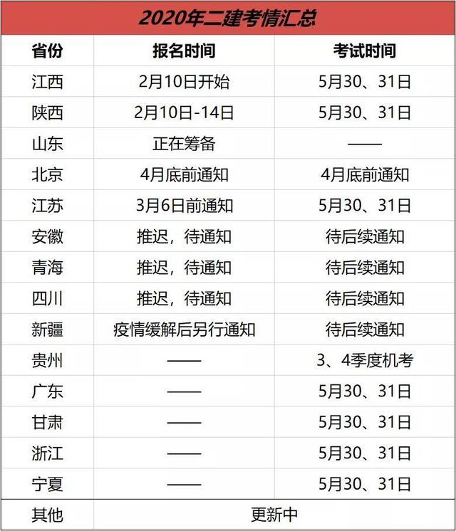 今年只有江西、陕西开展了二建报名工作,其他地区目前还没有明确延期考试的通知。