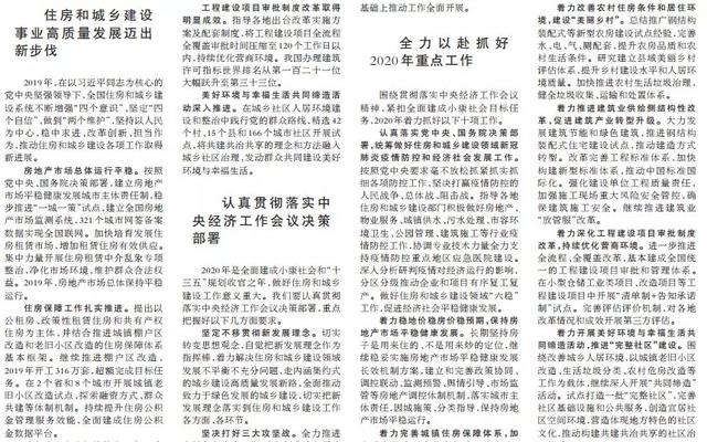 2020年是全面建成小康社会和“十三五”规划收官之年,做好住房和城乡建设工作意义重大。我们要认真贯彻落实中央经济工作会议决策部署,重点把握好以下几方面要求。