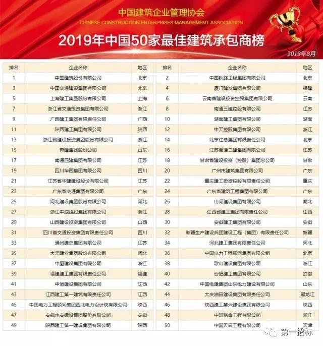 2019年《中国建筑企业综合实力100强》暨《中国50家最佳建筑承包商》排行榜发布,这是中国建筑企业管理协会对中国建筑业进行全面、科学、独立的企业实力发展调查研究宣传发布工作。通过对超过6000家利润总额在8000万元至330亿元之间的中国大陆建筑施工、勘察设计、工程监理等中国建筑企业进行了数据采集研究,基于对财务分析、行业分析、市场占有率分析确定候选企业,邀请100位企业高管、学者及官员对经资格审核符合要求的企业进行评选,比照国际上通行的做法,根据营业收入、资产总额、利润总额、资信等级、社会贡献、业主满意度等指标对候选企业进行综合评分排序,并对部分候选企业进行实地拜访,从中遴选出100家中国建筑企业综合实力100强企业及50家中国50家最佳建筑承包商企业。在此基础上通过与世界500强企业进行综合对比分析,进而有针对性地提出促进企业做强做大做久的策略建议,在全国范围内形成了巨大的社会影响力。