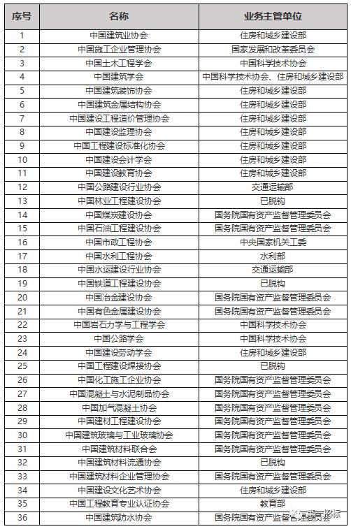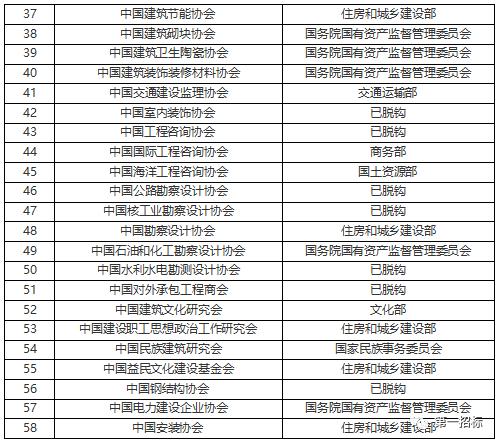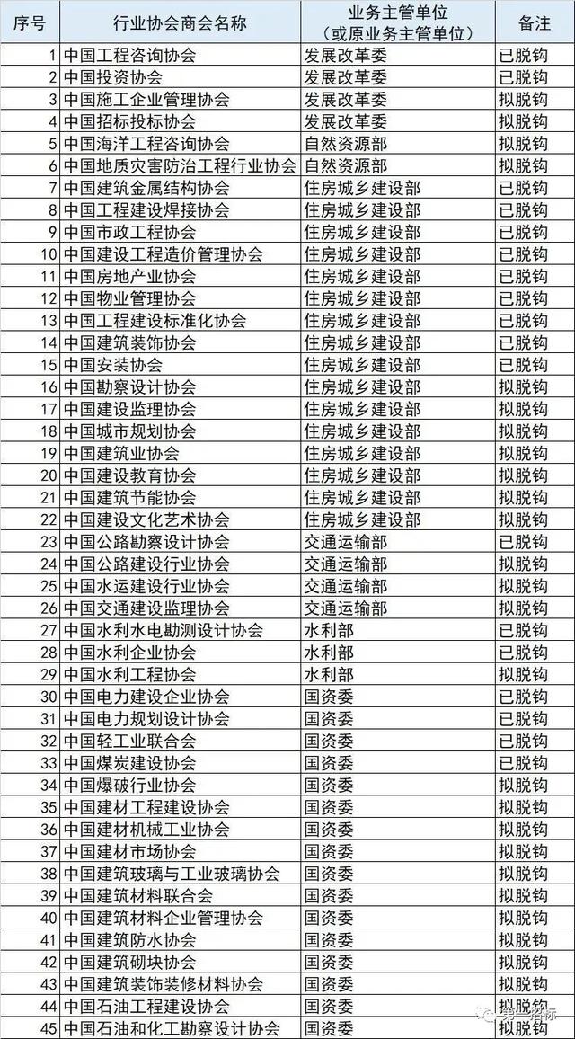 6.全国性行业协会商会脱钩改革名单共795家,已脱钩422家,拟脱钩373家。其中,中国建筑业协会、中国施工企业管理协会等建筑行业协会列入拟脱钩名单。