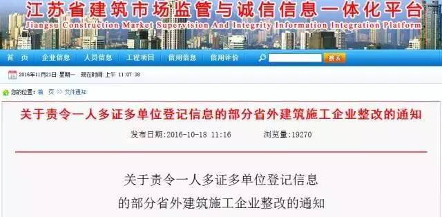 存在“一人多证,多单位登记”的建筑企业和个人,要立即整改。否则,将列入黑名单,并禁止进入江苏建筑市场。