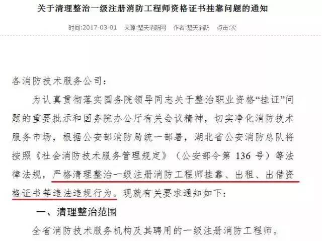 3、湖北:《关于清理整治一级注册消防工程师资格证书挂靠问题的通知》