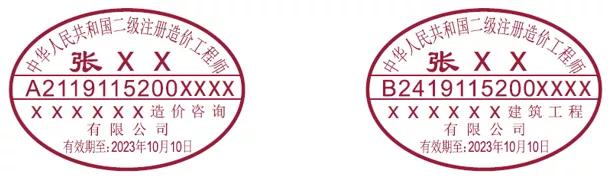 (二)造价工程师执业印章内容包括:造价工程师注册级别、姓名、执业印章编码、聘用单位名称、印章的有效期;