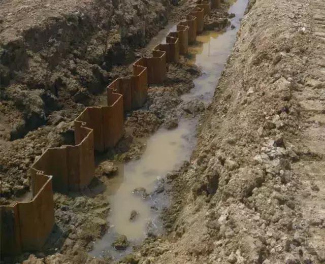 (5)密扣且保证开挖后入土不小于2米,保证钢板桩顺利合拢;特别是检查井位的四个角要使用转角钢板桩,若没有此类钢板桩,则用旧轮胎或烂布塞缝等辅助措施密封好,避免由于漏水带走泥沙,造成地面塌陷。