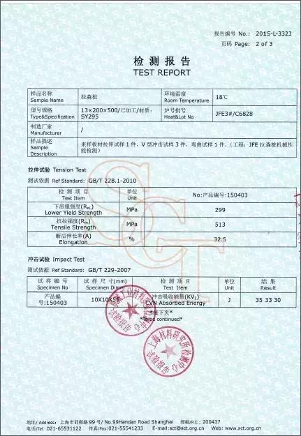 (2)材质检验:对钢板桩母材的化学成分及机械性能进行全面试验。包括钢材的化学成分分析,构件的拉伸、弯曲试验,锁口强度试验和延伸率试验等项内容。每一种规格的钢板桩至少进行一个拉伸、弯曲试验:每20-50t重的钢板桩应进行两个试件试验。